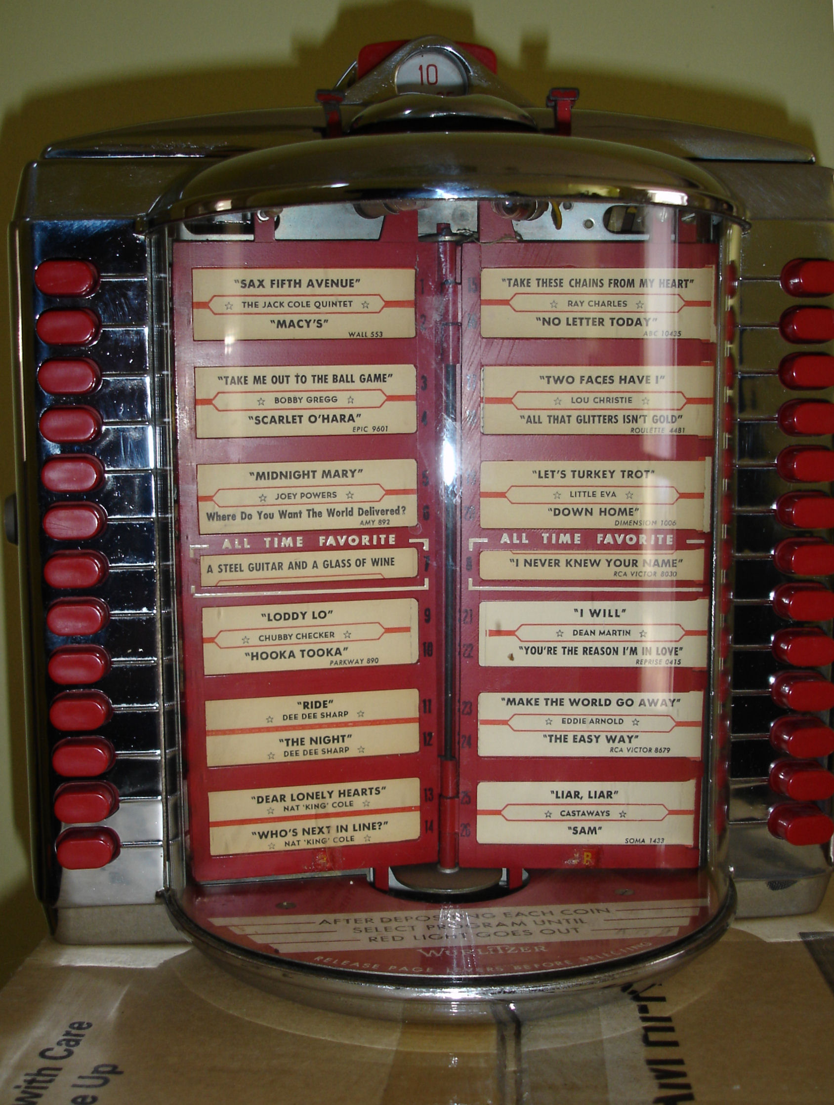 centennial anniversary it plays both sides of fifty two 45rpm records making one hundred and four selections,to make a selection you inserted your coins to get credet 5,10c or a quarter,then you made your selections by pressing a letter and number,the carousel would rotate,and when the selection was lined up with the lifting arms,there were two,one on the left and right side of the mech the record would lift from the carousel up towards the turntable,side A of the record would lift from the left side,and side B would lift from the right side,when the record was lined up with the turntable,the turntable would clamp the record and the tone arm would play the record on its side.