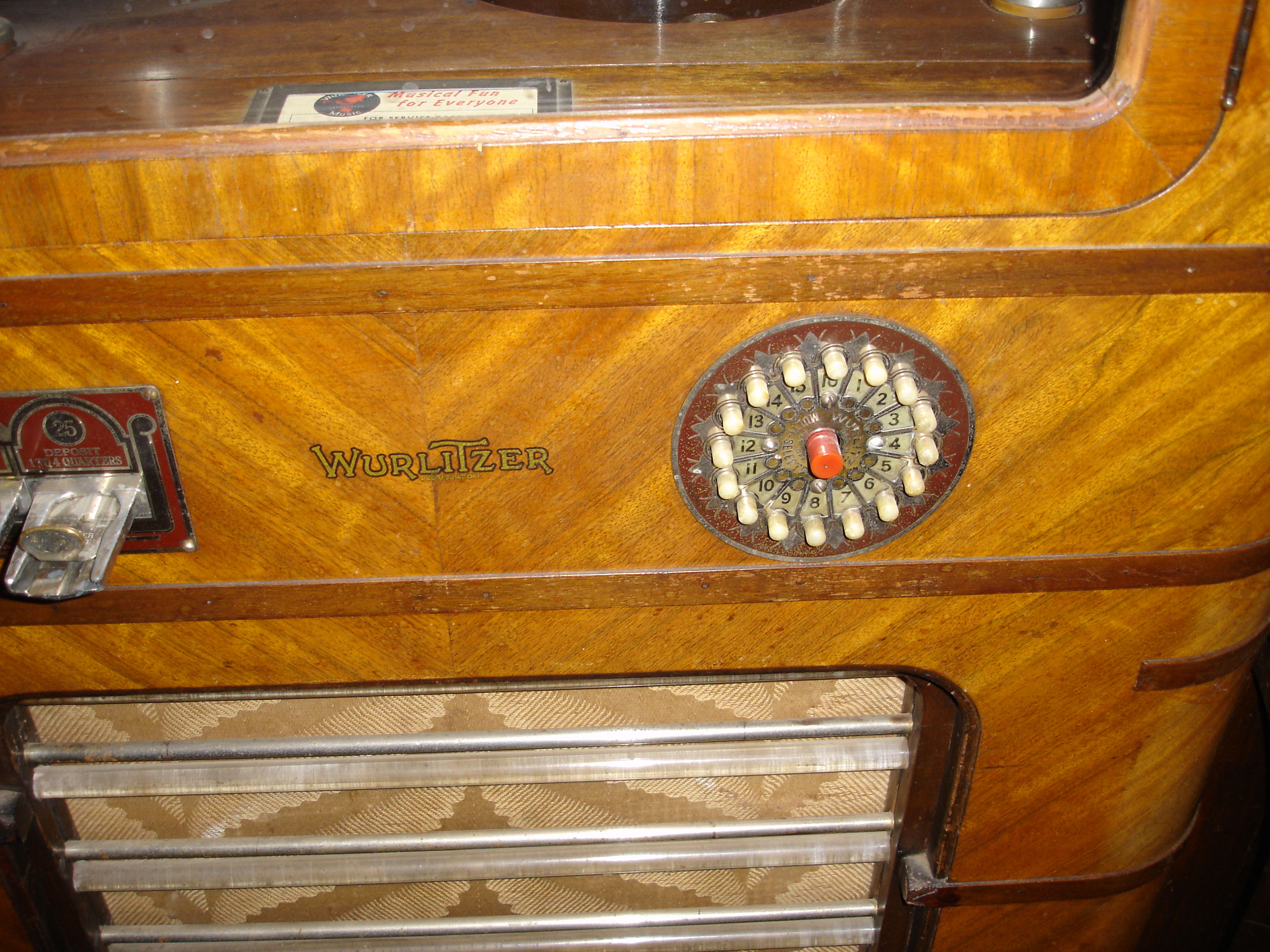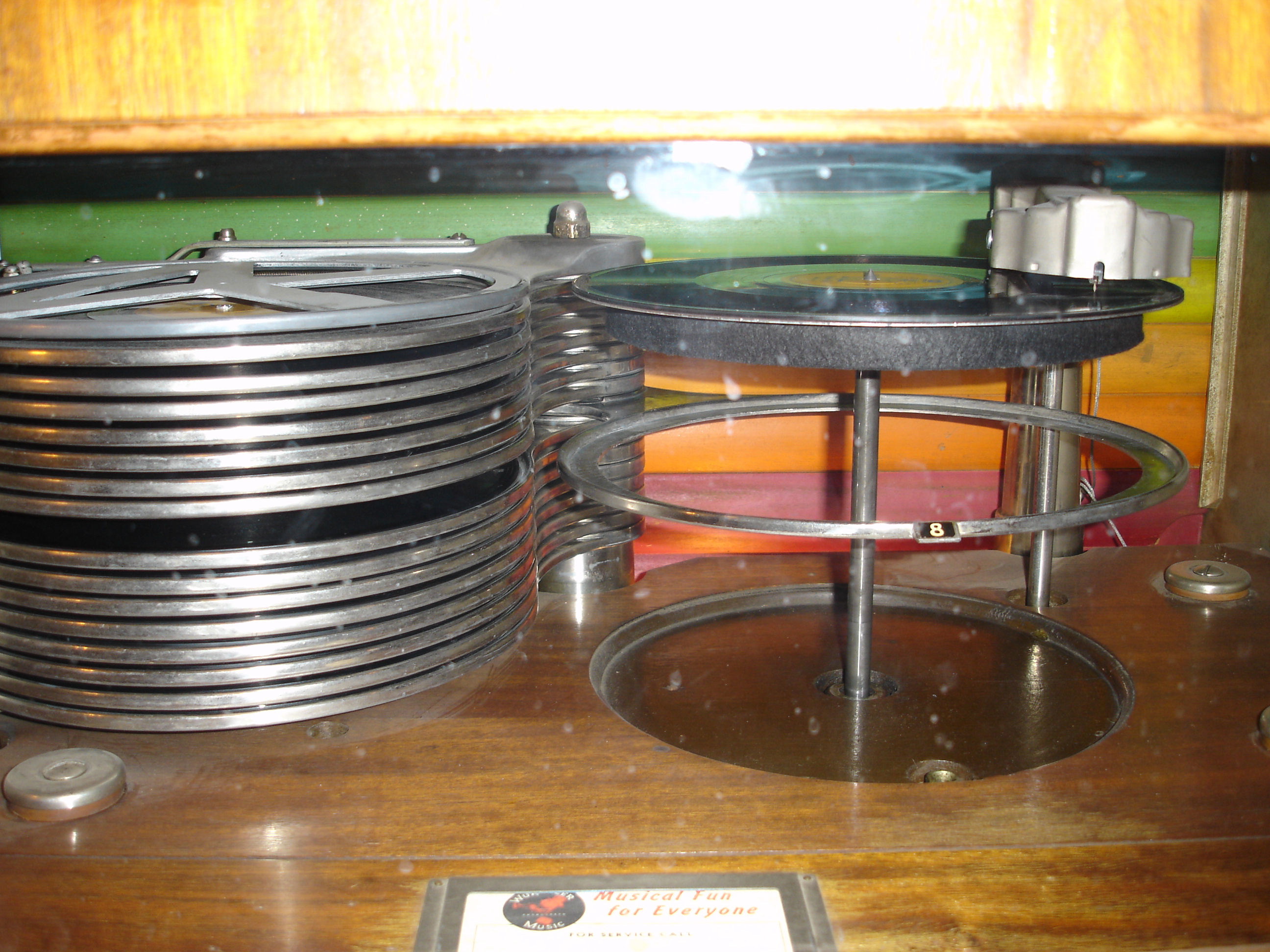 This Jukebox was produced in 1936/37 and was one of the 16 selection simplex models produced at this time,to make a selection you pressed one or more of the butttons on the rotary selector on the front of the machine then you inserted your coins 5c for one play,10c for two plays and a quarter for five plays the mech would then kick out the required tray and the turntable would rise to meet the disc and bring it up to the tone arm.The lighting is interesting as it was produced before the light up jukeboxes,the back of the mech is lit by a single bulb onto a rainbow painted board,at the front accros the speaker has lucite bars lit by six bulbs.
