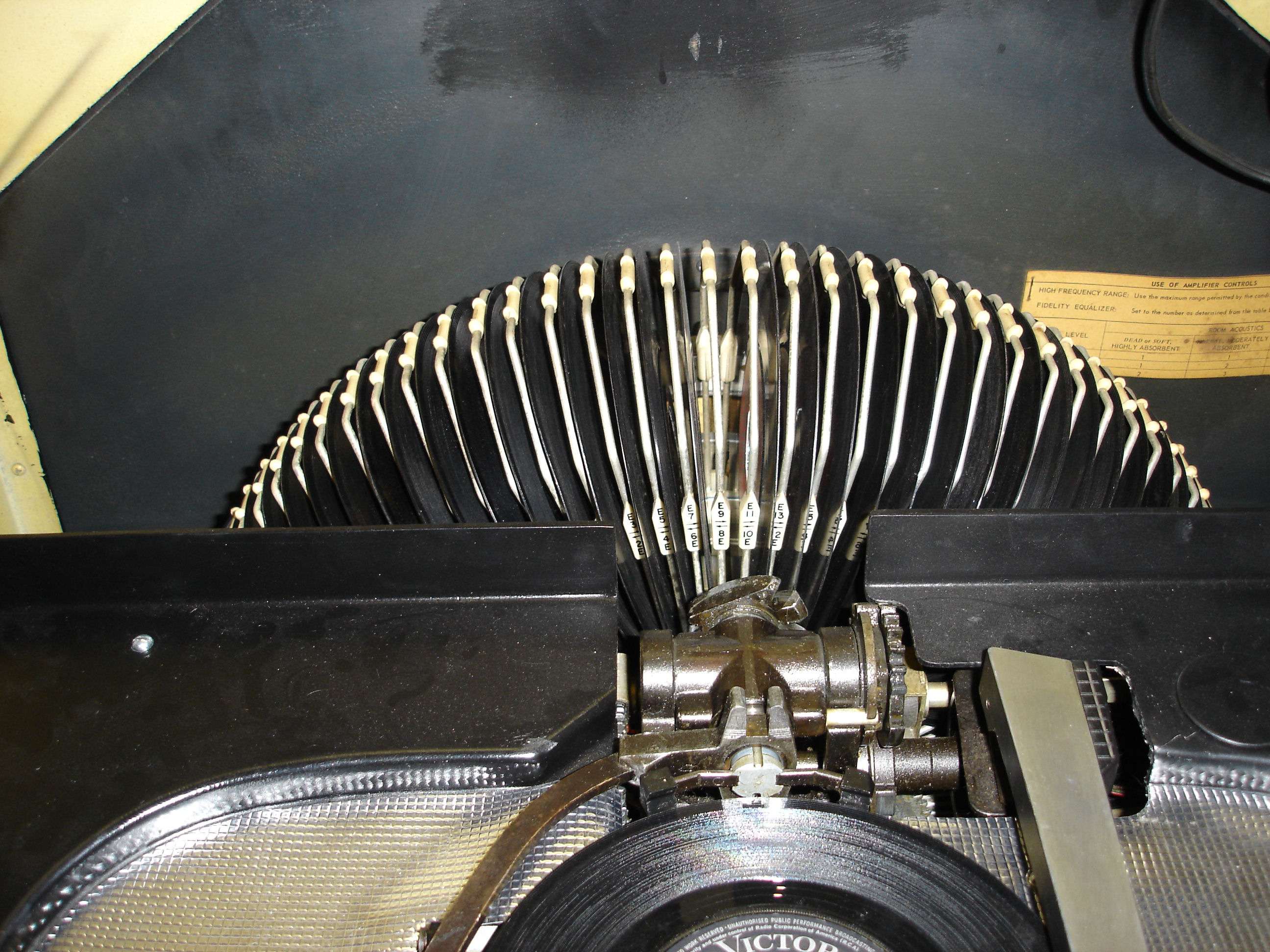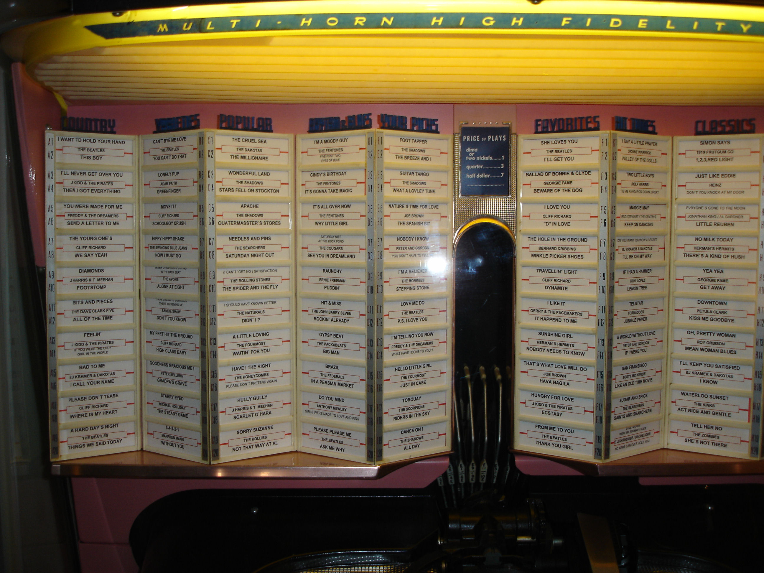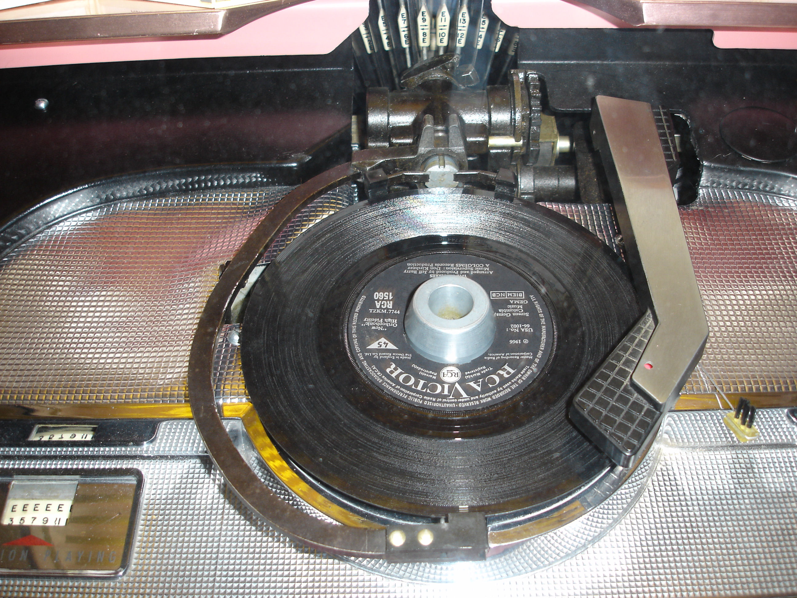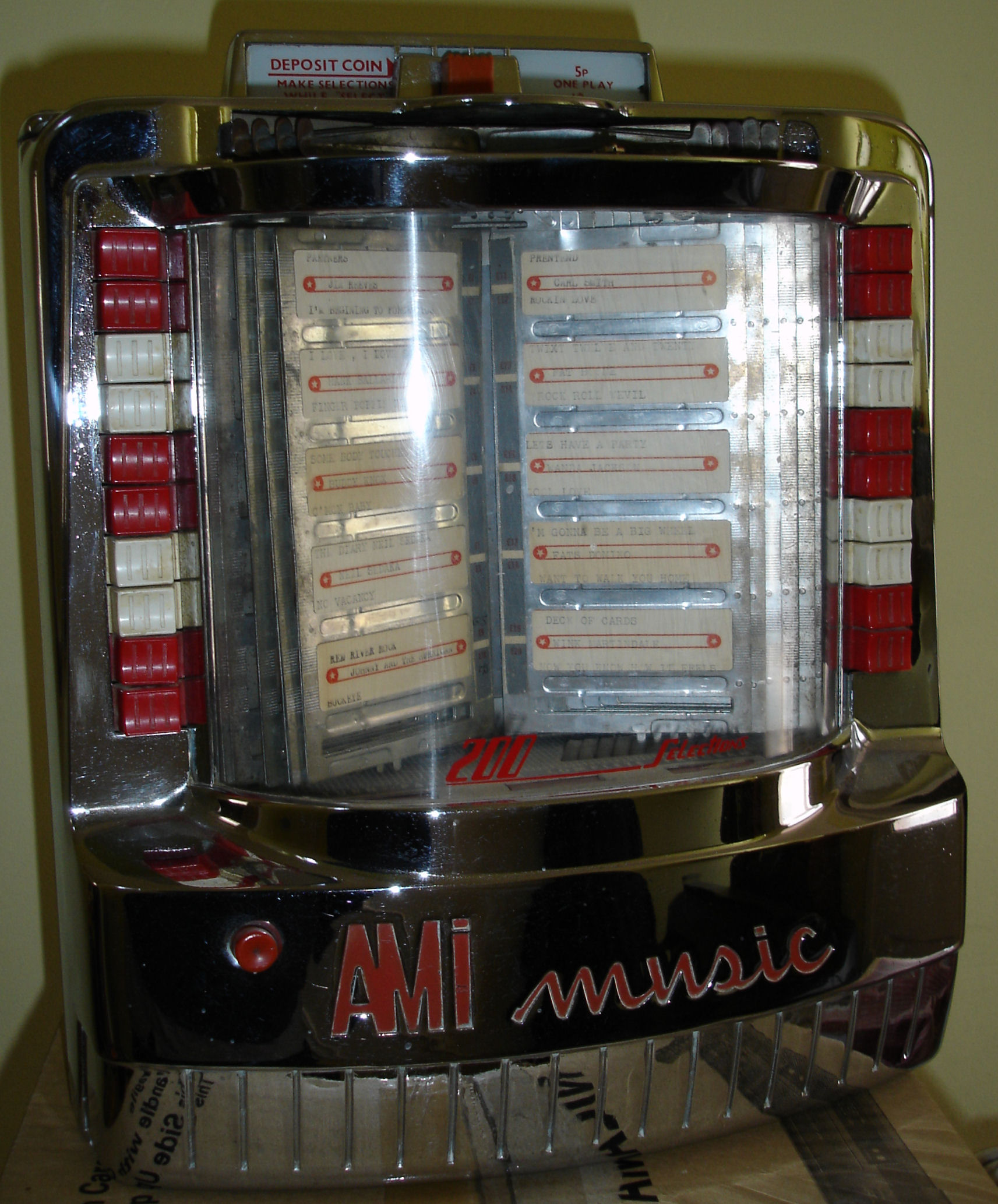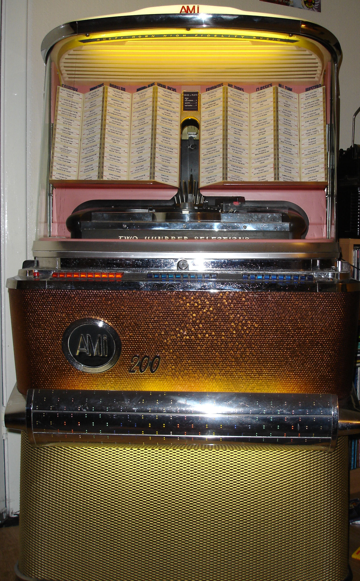 This Jukebox was produced in 1957 by AMI it plays both sides of one hundred 45rpm records,making 200 selections,the records are held in a carousel and when you make a selection the carousel would rotate until the selected record reached the top of the carousel,the the gripper would grab the record and pull it out of the carousel turn 180 degrees and place the record on the turntable and the tone arm would play the record.