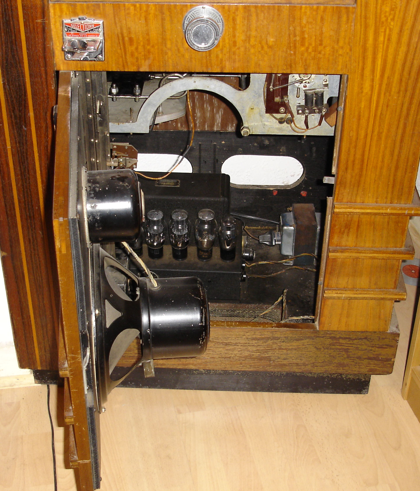 The amplifier has 7 valves/tubes (57,2x56,80,5Y3,2x2A3) The 57 is used as a preamp for the moving vain pickup,the two 56`s are conected in paralell and used to drive a phase splitting transformer,which in turn drives the push pull output stage using two 2A3 output triodes which drives via output transformer two speakers,one which is a high frequency speaker,the 5Y3 rectifier is used for the HT etc ,and the 80 is used for biasing the two directly heated 2A3`s