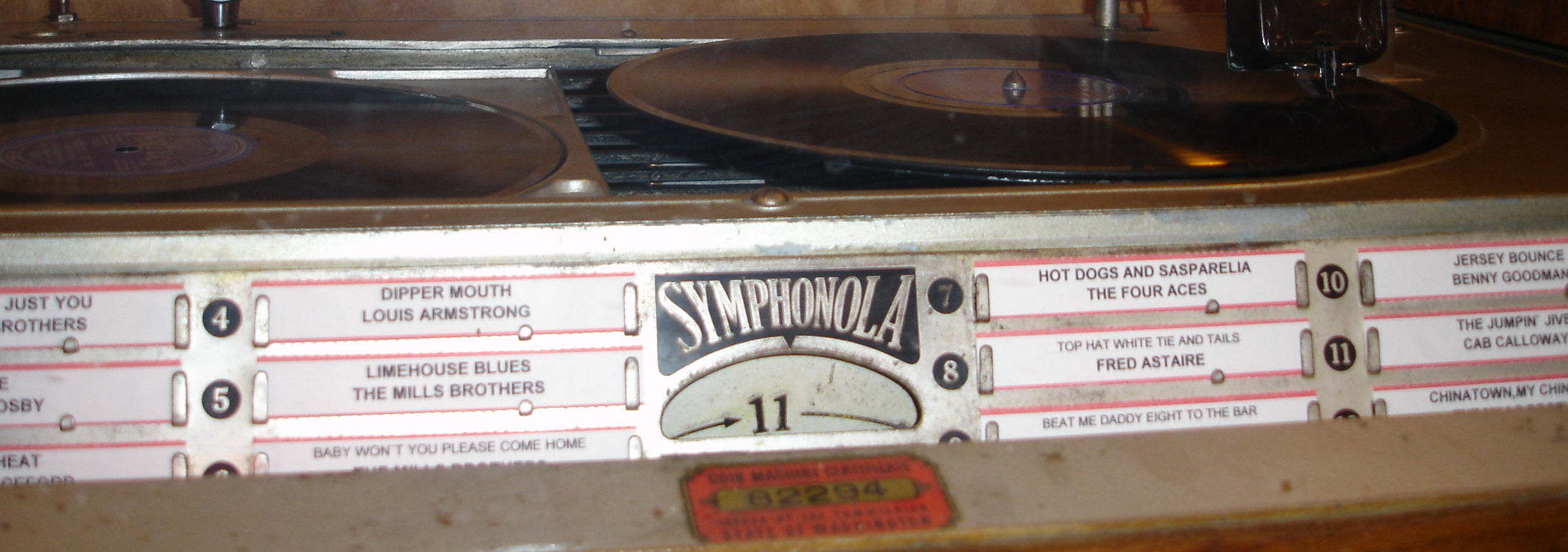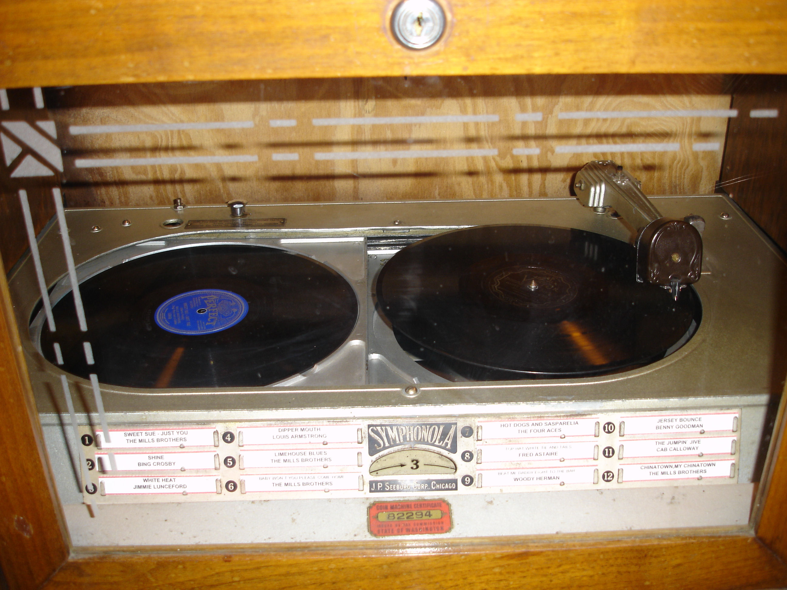 This Jukebox is a Seeburg Synphanola Model D,It was produced in 1936 it has 12 selections,It looks like the previous model C but uses a different amplifier and has an extra speaker for high frequencies.You make your selection by turning the knob to the requied selection and then insert a nickel (5c Coin) for one tune or a dime (10c coin) for two tune`s,the record (which is located on the left hand side,in a stack of sliding tray`s) slid`s over to the right hand side,and the the turntable rises and picks up the record from the tray and on to the pickup.